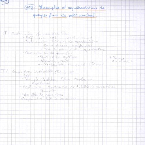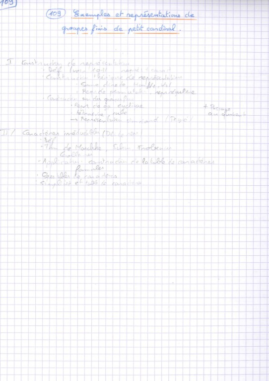 109 - Représentations de groupes finis de petit cardinal. Il s'agit d'une leçon où le matériel théorique doit figurer, pour ensuite laisser place à des exemples. Les représentations peuvent provenir d'actions de groupes sur des ensembles finis, de groupes d'isométries, d'isomorphismes exceptionnels entre groupes de petit cardinal... Inversement, on peut chercher à interpréter des représentations de façon géométrique, mais il faut avoir conscience qu'une table de caractères provient généralement de représentations complexes et non réelles, a priori . Pour prendre un exemple ambitieux, la construction de l'icosaèdre à partir de la table de caractères de $\matfrak{A}_5$ demande des renseignements sur l'indice de Schur (moyenne des caractères sur les carrés des éléments du groupe).
