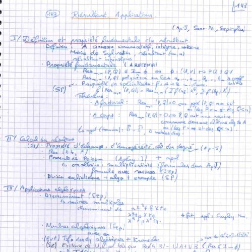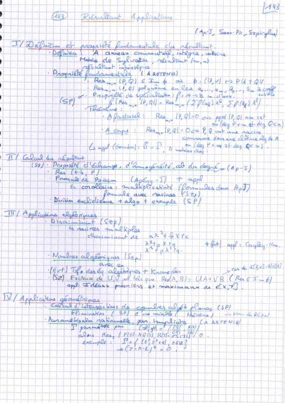 143 - Résultant. Applications. Le caractère entier du résultant (il se définit sur Z ) doit être mis en valeur et appliqué. La partie application doit montrer la diversité du domaine (par exemple en arithmétique, calcul d'intersection/élimination, calcul différentiel, polynômes annulateurs d'entiers algébriques). Il ne faut pas perdre de vue l'application linéaire sous-jacente $(U,V) \longmapsto AU + BV$ qui lie le résultant et le pgcd de $A$ et $B$.