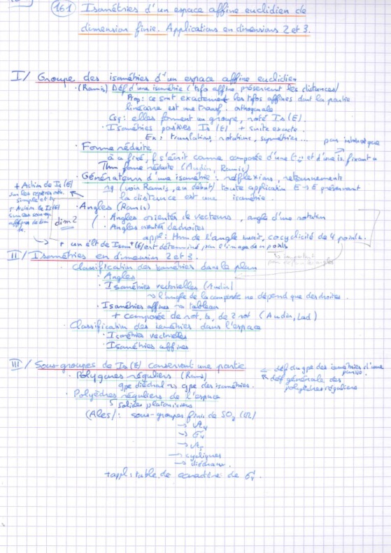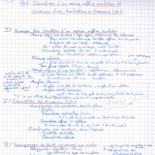 2014 161 - Isométries d'un espace affine euclidien de dimension finie. Applications en dimensions $2$ et $3$.) La classification des isométries en dimension 2 est exigible. En dimension 3, les rotations et les liens avec la réduction. On peut penser aux applications aux isométries laissant stables certaines figures en dimension 2 et 3.