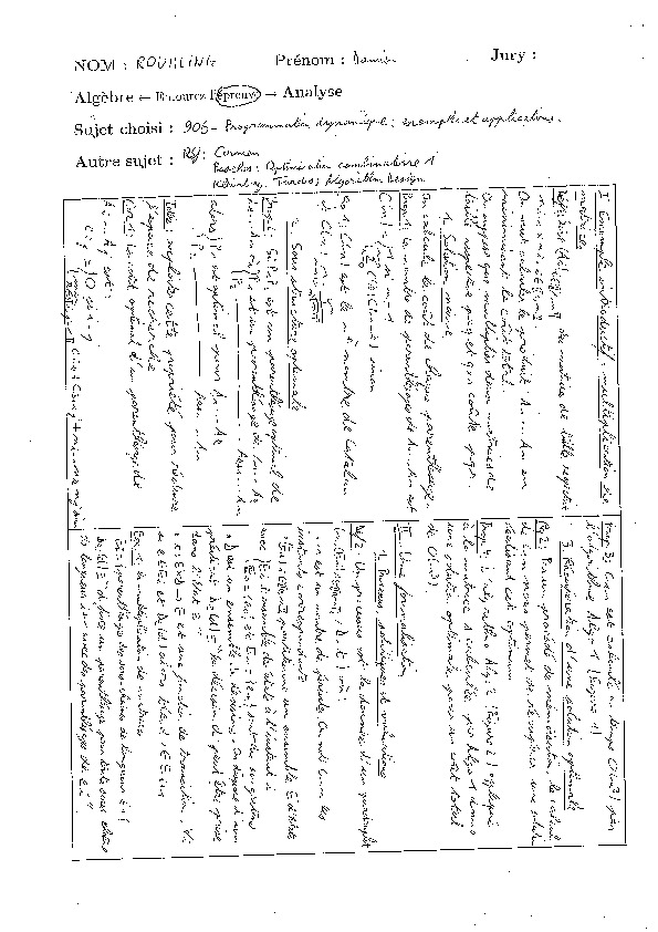 906 - Programmation dynamique : exemples et applications. Même s'il s'agit d'une leçon d'exemples et d'applications, le jury attend des candidats qu'ils présentent les idées générales de la programmation dynamique et en particulier qu'ils aient compris le caractère générique de la technique de mémoïsation. Le jury appréciera que les exemples choisis par le candidat couvrent des domaines variés, et ne se limitent pas au calcul de la longueur de la plus grande sous-séquence commune à deux chaînes de caractères. Le jury ne manquera pas d'interroger plus particulièrement le candidat sur la question de la correction des algorithmes proposés et sur la question de leur complexité en espace.