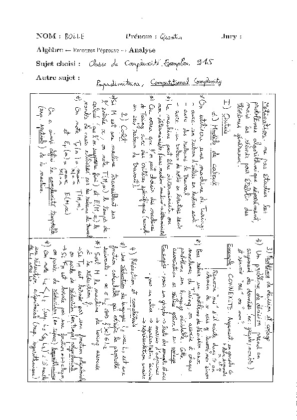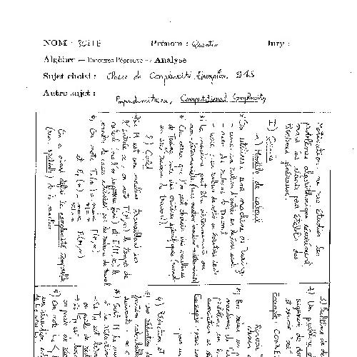 915 - Classes de complexité : exemples. Le jury attend que le candidat aborde à la fois la complexité en temps et en espace. Il faut naturellement exhiber des exemples de problèmes appartenant aux classes de complexité introduites, et montrer les relations d'inclusion existantes entre ces classes. Le jury s'attend à ce que le caractère strict ou non de ces inclusions soit abordé, en particulier le candidat doit être capable de montrer la non-appartenance de certains problèmes à certaines classes. Parler de décidabilité dans cette leçon serait hors sujet.