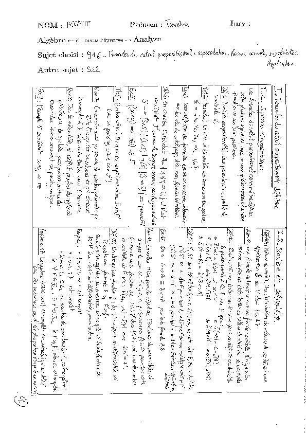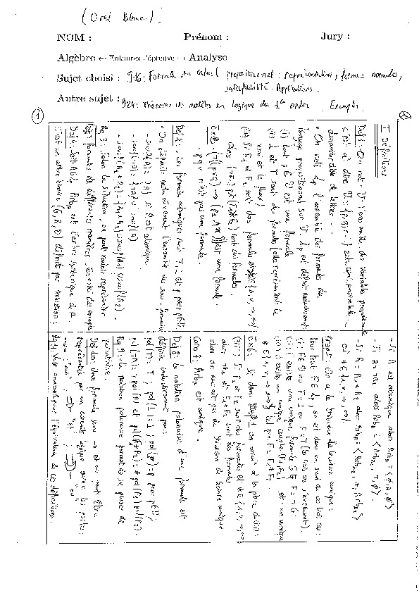 916 - Formules du calcul propositionnel : représentation, formes normales, satisfiabilité. Applications. Le jury attend des candidats qu'ils abordent les questions de la complexité de la satisfiabilité. Pour autant, les applications ne sauraient se réduire à la réduction de problèmes NP-complets à SAT. Une partie significative du plan doit être consacrée à la représentation des formules et à leurs formes normales.
