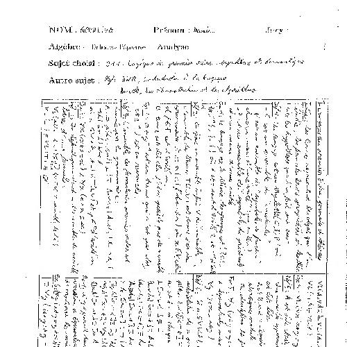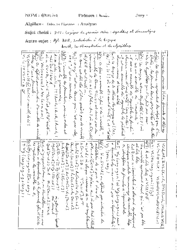 917 - Logique du premier ordre : syntaxe et sémantique. La question de la syntaxe dépasse celle de la définition des termes et des formules. Elle comprend aussi celle des règles de la démonstration. Le jury attend donc du candidat qu'il présente au moins un système de preuve et les liens entre syntaxe et sémantique, en développant en particulier les questions de correction et complétude.