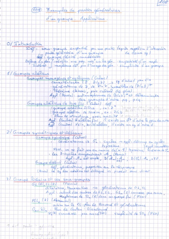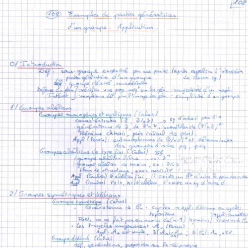 2015 108 - Exemples de parties génératrices d'un groupe. Applications.) C'est une leçon qui demande un minimum de culture mathématique. Peu de candidats voient l'utilité des parties génératrices dans l'analyse des morphismes de groupes ou pour montrer la connexité de certains groupes. Tout comme dans la leçon 106, la présentation du pivot de Gauss et de ses applications est envisageable.