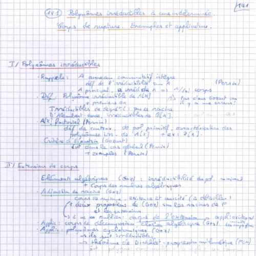 La présentation du bagage théorique permettant de définir corps de rupture, corps de décomposition, ainsi que des illustrations dans différents types de corps (réel, rationnel, corps finis) sont inévitables. Les corps finis peuvent être illustrés par des exemples de polynômes irréductibles de degré 2, 3, 4 sur $F_2$ ou $F_3$ . Il est nécessaire de présenter des critères d’irréductibilité de polynômes et des polynômes minimaux de quelques nombres algébriques.