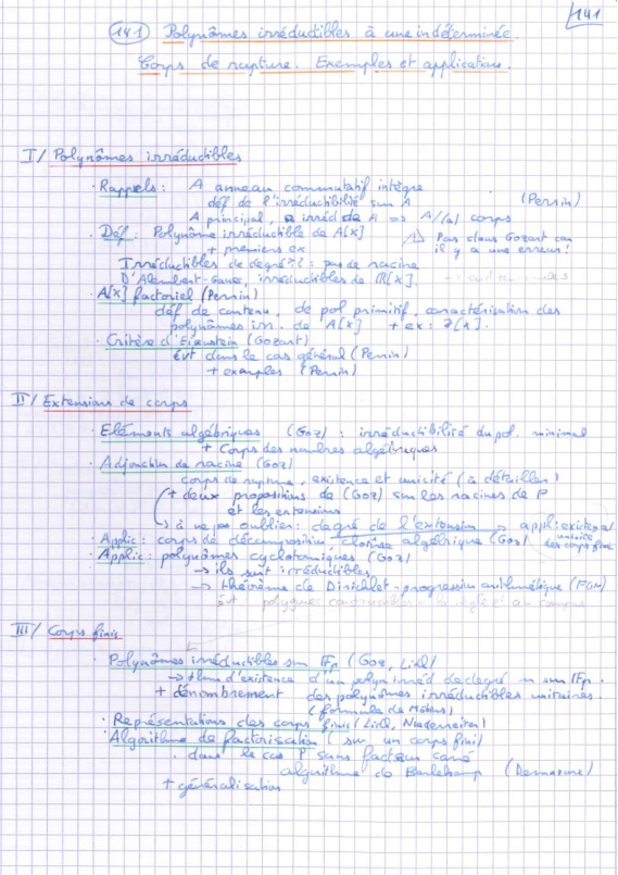 Le jury attend dans cette leçon un bagage théorique permettant de définir corps de rupture, corps de décomposition (la preuve de l'unicité de ce dernier n'est pas exigée), ainsi que des illustrations dans différents types de corps (réel, rationnel, corps finis).