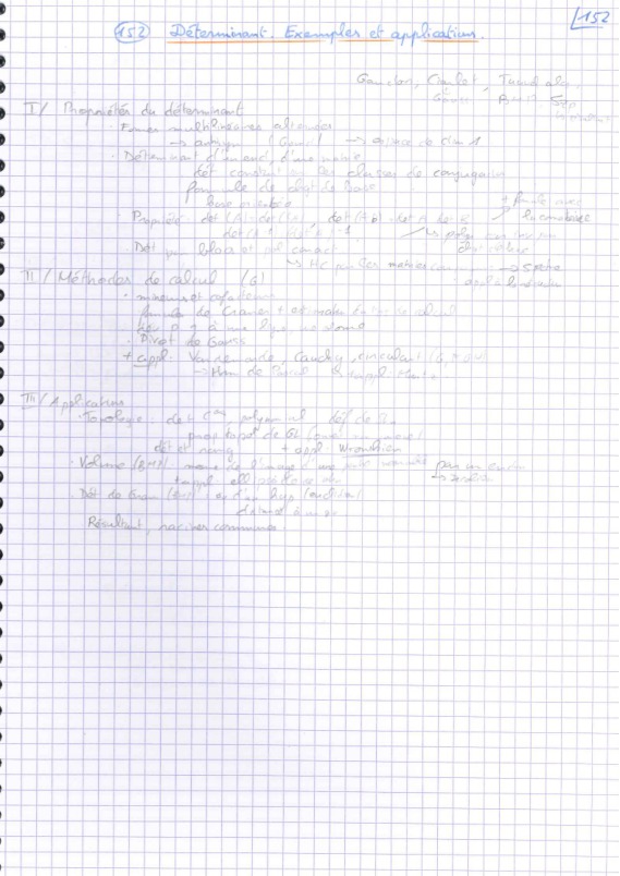 Il faut que le plan soit cohérent ; si le déterminant n'est défini que sur $R$ ou $C$, il est délicat de définir $det(A - XIn)$ avec $A$ une matrice carrée. L'interprétation du déterminant comme volume est essentielle. Beaucoup de candidats commencent la leçon en disant que le sous-espace des formes $n$-linéaires alternées sur un espace de dimension $n$ est de dimension 1, ce qui est fort à propos.