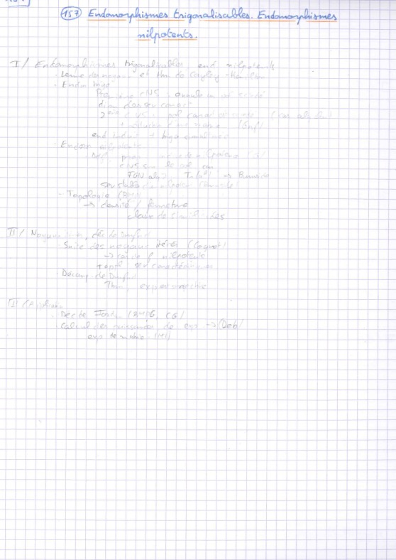 L’utilisation des noyaux itérés est fondamentale dans cette leçon, ceci pour déterminer si deux matrices nilpotentes sont semblables par exemple. Il est intéressant de présenter des conditions suffisantes de trigonalisation simultanée ; l’étude des endomorphismes cycliques a toute sa place dans cette leçon. Notons que l’étude des nilpotents en dimension 2 débouche naturellement sur des problèmes de quadriques et que l’étude sur un corps fini donne lieu à de jolis problèmes de dénombrement.