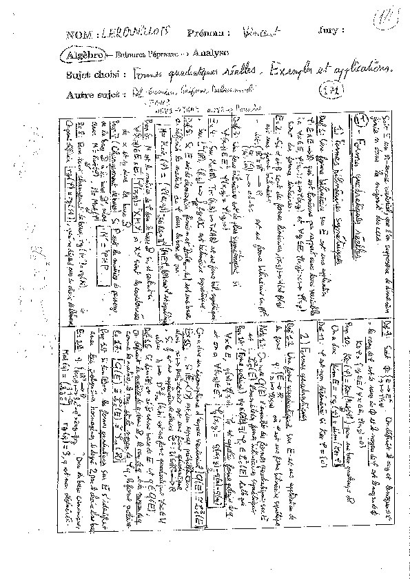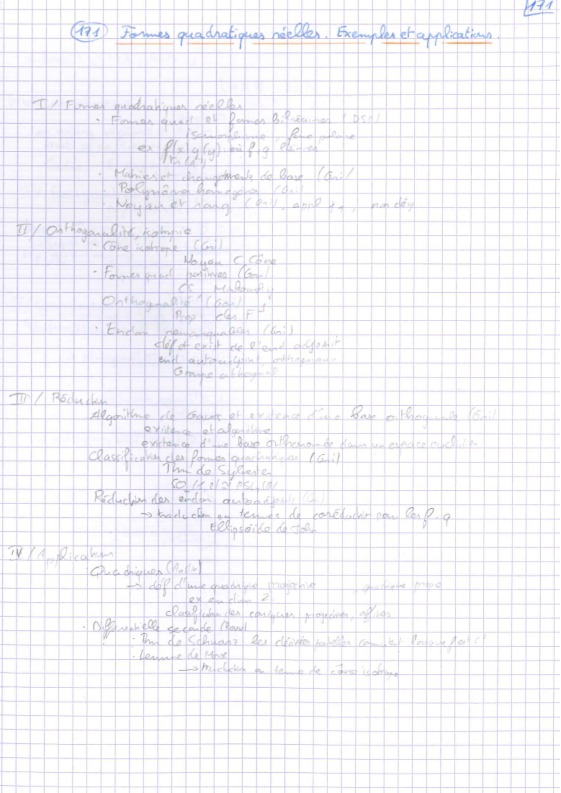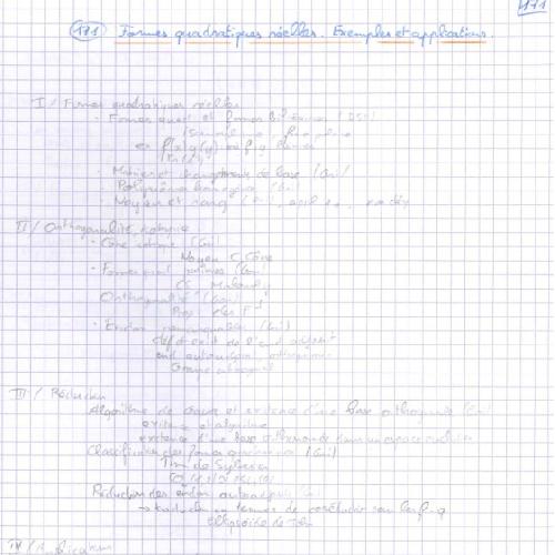 La preuve de la loi d'inertie de Silvester doit être connue ainsi que l'orthogonalisation simultanée. Le candidat doit avoir compris la signification géométrique de ces deux entiers composant la signature d'une forme quadratique réelle ainsi que leur caractère classifiant. La différentielle seconde d'une fonction de plusieurs variables est une forme quadratique importante.