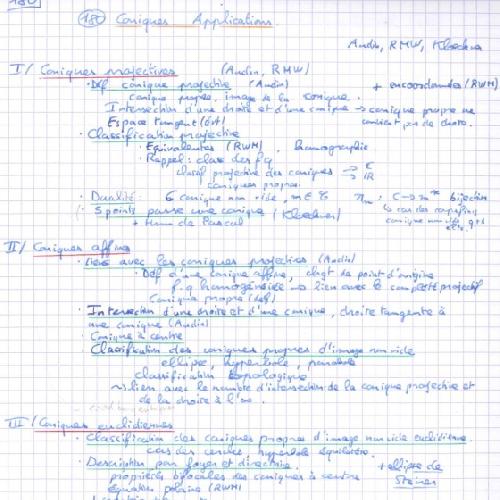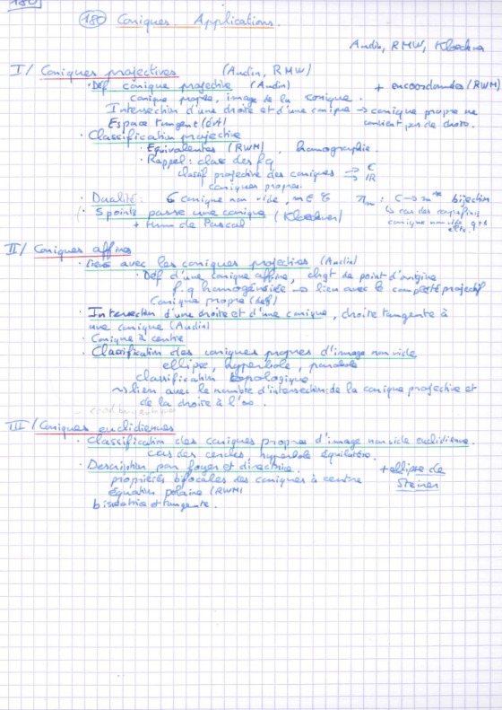 La définition des coniques affines non dégénérées doit être connue. Les propriétés classiques des coniques doivent être présentées. Bien distinguer les notions affines, métriques ou projectives, la classification des coniques étant sensiblement différente selon le cas. Souvent le candidat annonce qu'il va "classifier les coniques" mais sans être capable de préciser la nature de cette classification. Plus généralement, il serait bien que les candidats aient réfléchi à ce que l'on entend par "classification" en mathématiques.
