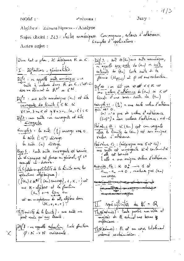 Cette leçon permet souvent aux candidats de s’exprimer. Il ne faut pas négliger les suites de nombres complexes. Le théorème de Bolzano-Weierstrass doit être cité et le candidat doit être capable d’en donner une démonstration. On attend des candidats qu’ils parlent des limites inférieure et supérieure d’une suite réelle bornée, et qu’ils en maîtrisent le concept. Les procédés de sommation peuvent être éventuellement évoqués mais le théorème de Cesàro doit être mentionné et sa preuve maîtrisée par tout candidat à l’agrégation. Les résultats autour des sous-groupes additifs de R permettent d’exhiber des suites denses remarquables et l’ensemble constitue un joli thème.